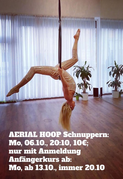 Die nächsten Aerial Hoop Schnupperstunde findet am Montag, dem 06.10. von 20:10-21:10 statt und kostet 10€.
