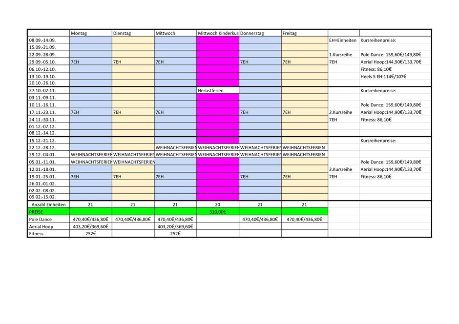 Eine Kursreihe besteht aus 6 oder 7 Einheiten (je nach Feiertagen), ist aber kein 6er- oder 7er-Block, sondern geht über 6 oder 7 Wochen ab der 1.Einheit!!
