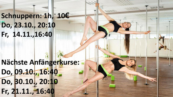 Die nächsten Pole Dance Schnupperstunden finden am Do, dem 02.10. um 16:40, am Do, dem 23.10. um 20:10, und am Fr, dem 14.11. um 16:40 statt.